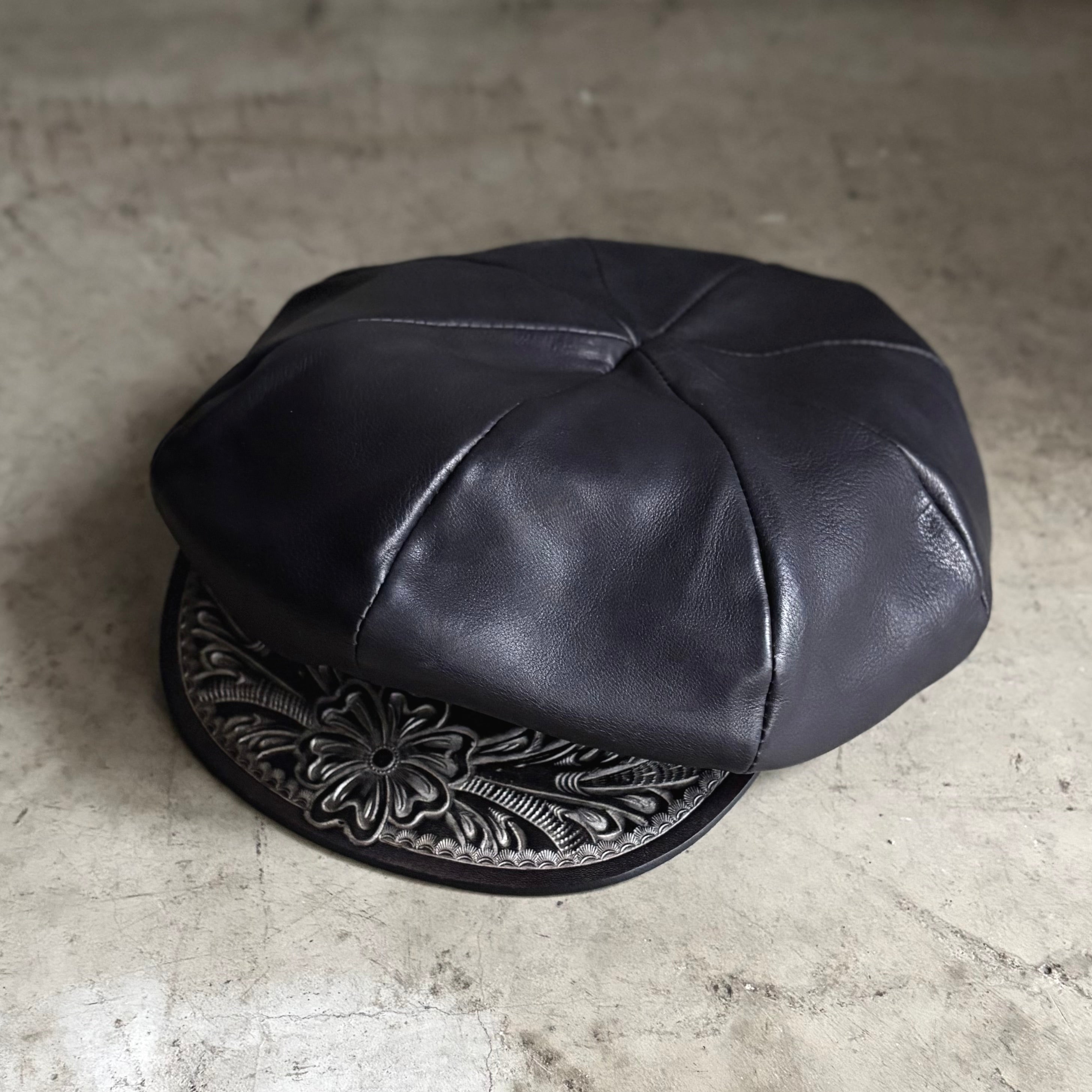 ブリム部分にカービングを施し、独自技法"The Ore"(ジ・オーア)純銀で着色したATSUを代表するオールレザーキャスケット。
