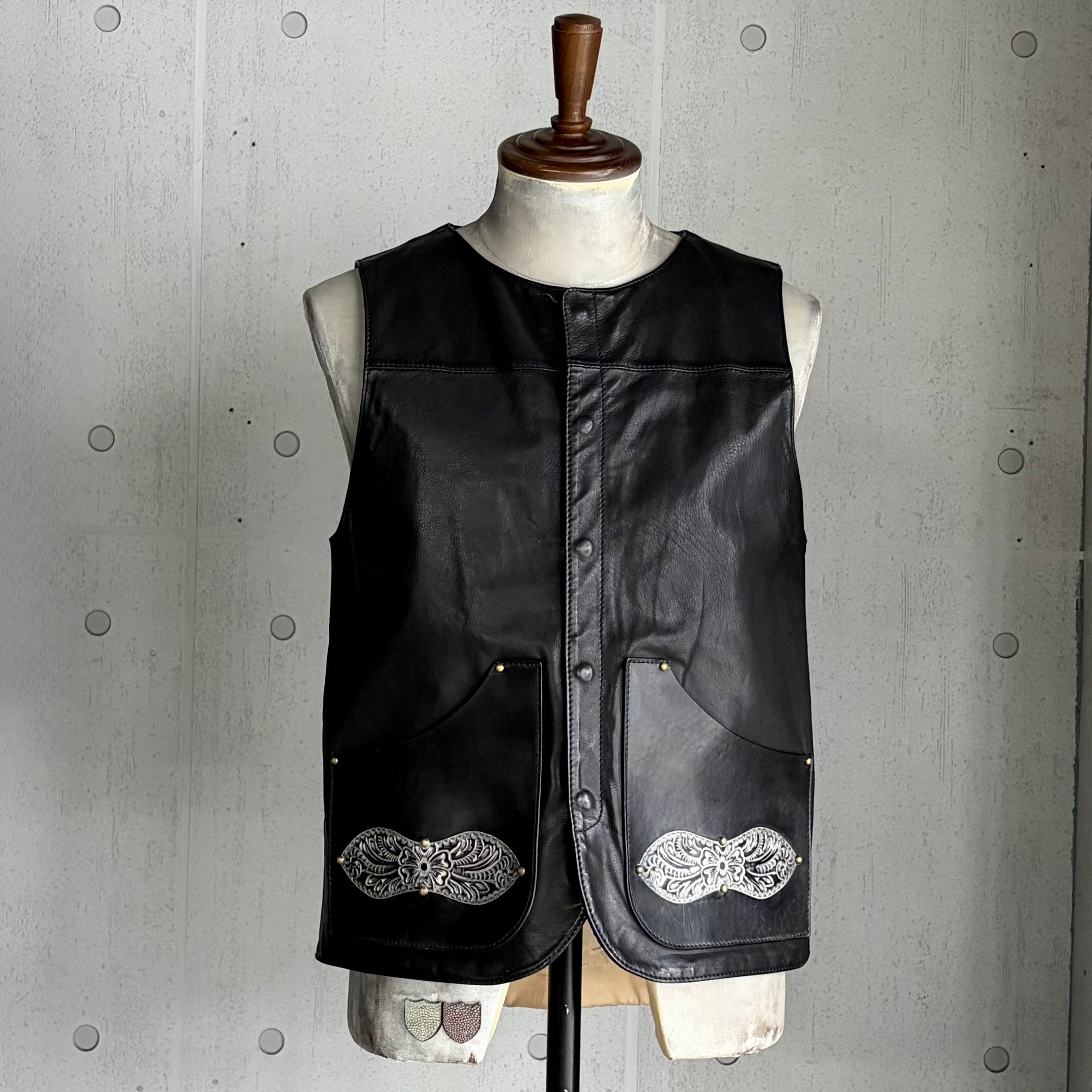 しなやかなカーフレザーのボディーにThe Ore(ジ・オーア)純銀のポケットを組み合わせ、柔と剛を表現したレザーベスト。