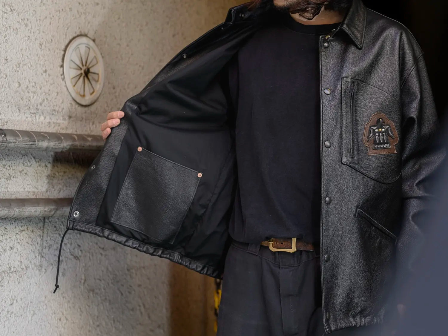 ナイロン素材で知られる コーチジャケットをレザーでアップデート。 現在もライダースジャケットのポケットとして愛される Dポケットを胸元に配置しクラシカルな印象に。 ゆったりとした身幅や、 裾に配したドローコードでシルエット調整も可能となり 既存のライダースとは全く違うコンセプトのジャケットです。